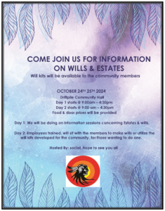 Community members are invited to attend our upcoming event on October 24th & 25th, 2024 at the Driftpile Community Hall. We will provide important information and resources on Wills & Estates.