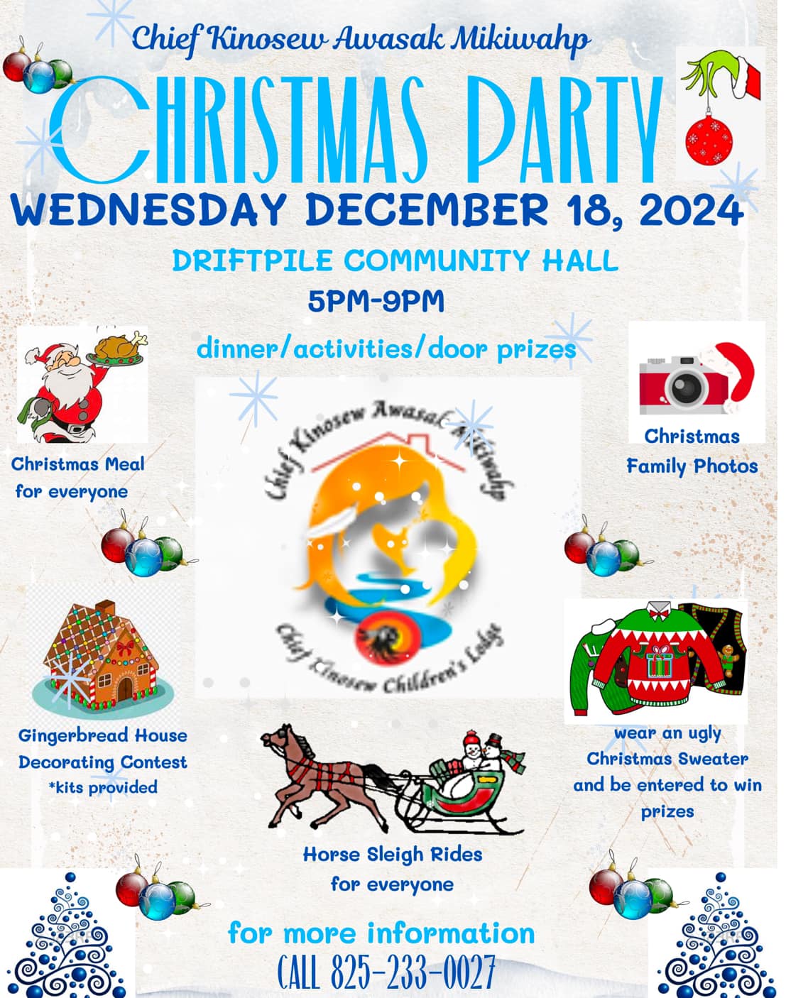 📅 Date: Wednesday, December 18, 2024 📍 Location: Driftpile Community Hall ⏰ Time: 5:00 PM – 9:00 PM Join us for an evening filled with holiday cheer, festive activities, and fun for the whole family! ✨ Event Highlights: 🎅 Christmas Meal: Enjoy a delicious Christmas dinner together. 🏠 Gingerbread House Decorating Contest: Kits provided! Show […]
